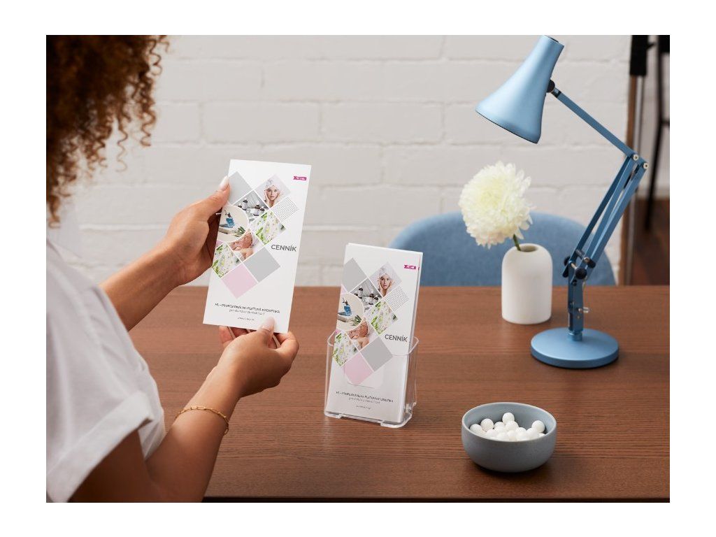 Profesionálně vytištěný B2C ceník značky HL ve formátu A3, složený na 3 části (tri-fold). Praktický „ceník-leták“, který můžete umístit na recepci, do čekárny nebo do prodejní zóny a zároveň ho využít jako informační materiál pro klienta – aby si ho mohl vzít domů a v klidu se rozhodnout.