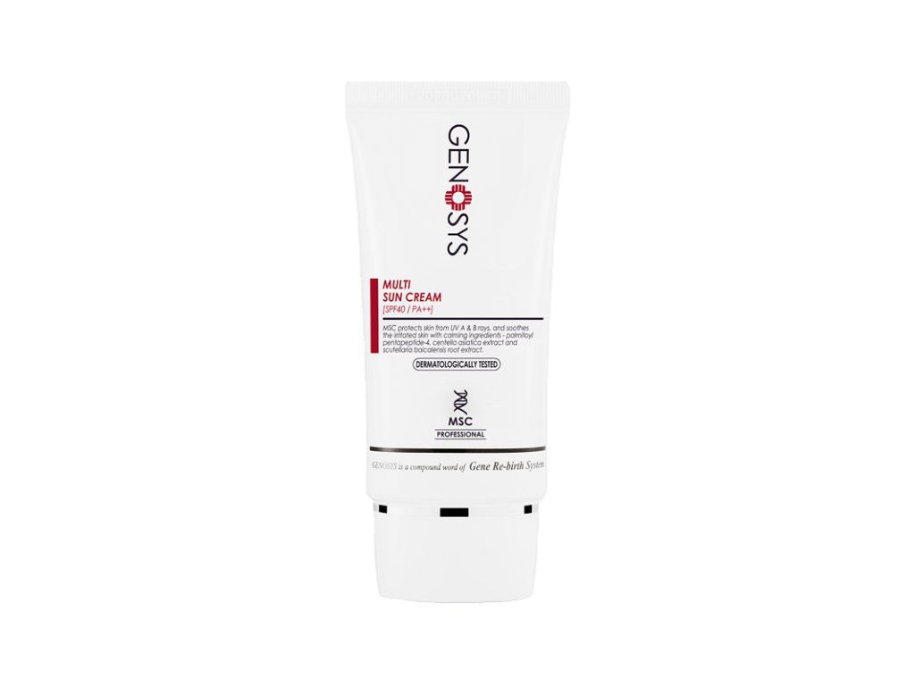 Multifunkční opalovací krém, který je vždy oblíben mezi spotřebiteli všech věkových kategorií. Genosys Multi-Sun Protection Cream SPF40 účinně odráží paprsky typu A a B díky bezpečnému fyzickému filtru – oxidu titaničitému. Receptura produktu je obohacena o komplex kmenových buněk růže a hroznů, výtažky z centely a lebky, dále obsahuje palmitoyl pentapeptid-4, laktobacily a další složky, které poskytují komplexní péči o jakýkoli typ pleti.
